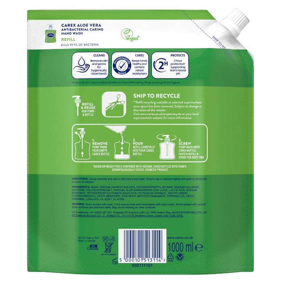 HAND WASH REFILLS: This Carex Aloe Vera refill allows you to do your bit for the planet by reusing your pump & bottle from your Carex hand wash, and saves you money compared to 4 x 250ml bottles