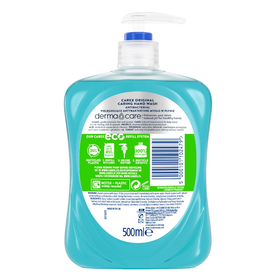 Washing your hands with Carex is one of the easiest ways to remove grease and dirt for hygienically clean hands. Our range of antibacterial liquid hand wash is created from a trusted and expertly made formulation which cleans and cares for your skin. The liquid hand soap protects your skin’s’ natural antibacterial defences 2 hours after washing. This original hand wash gently cleanses skin whilst removing dirt and germs, making it suitable for the whole family. Our hand wash is vegan and dermatologically tested. You can now do your bit for the planet by reusing your pump and bottle from your Carex hand wash. Carex antibacterial hand wash is also available in Aloe Vera, Sensitive and Moisturising formulations. Always practice good hand hygiene.